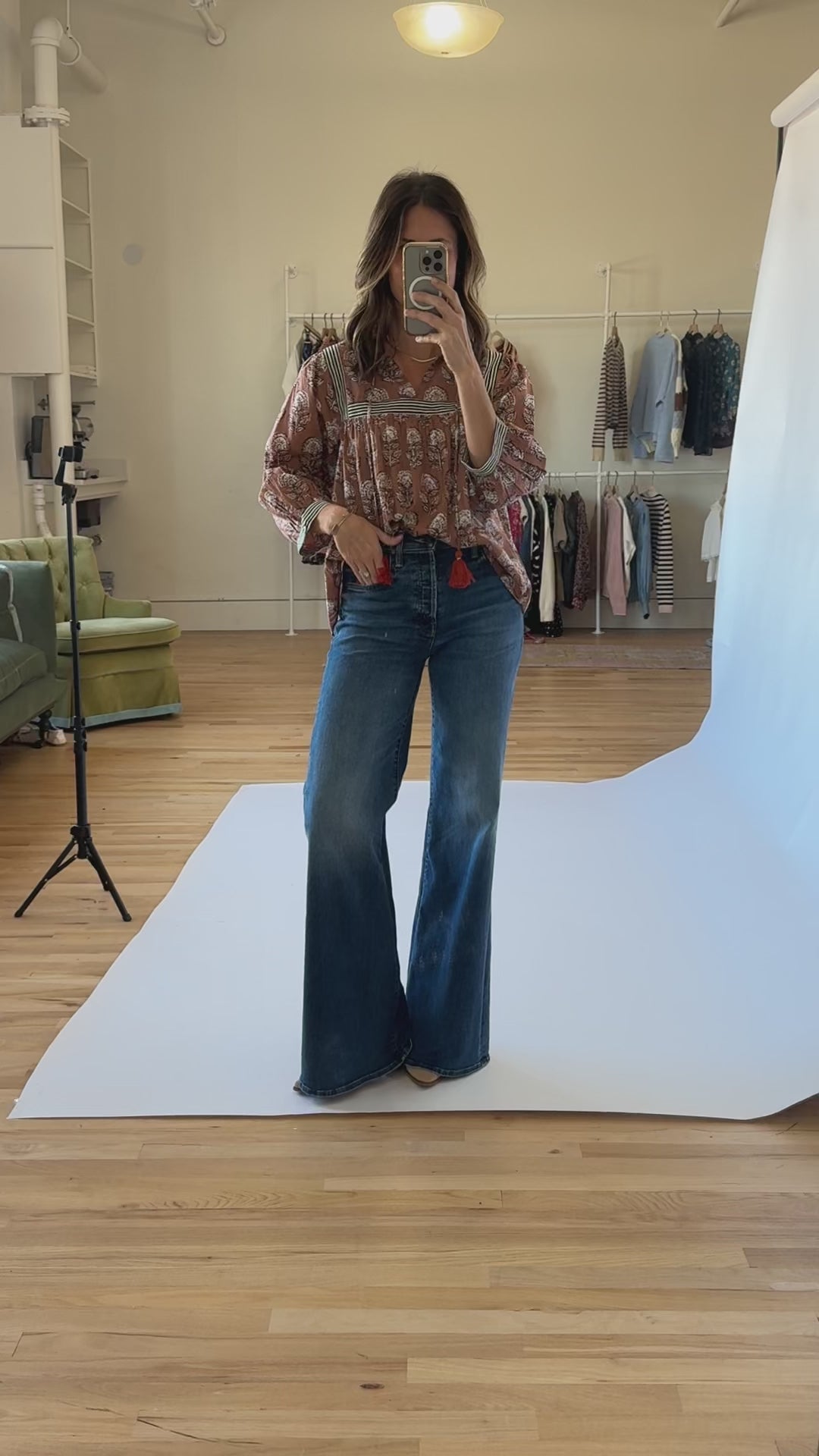 Light brown block print top with split v-neck and tassel tie detail