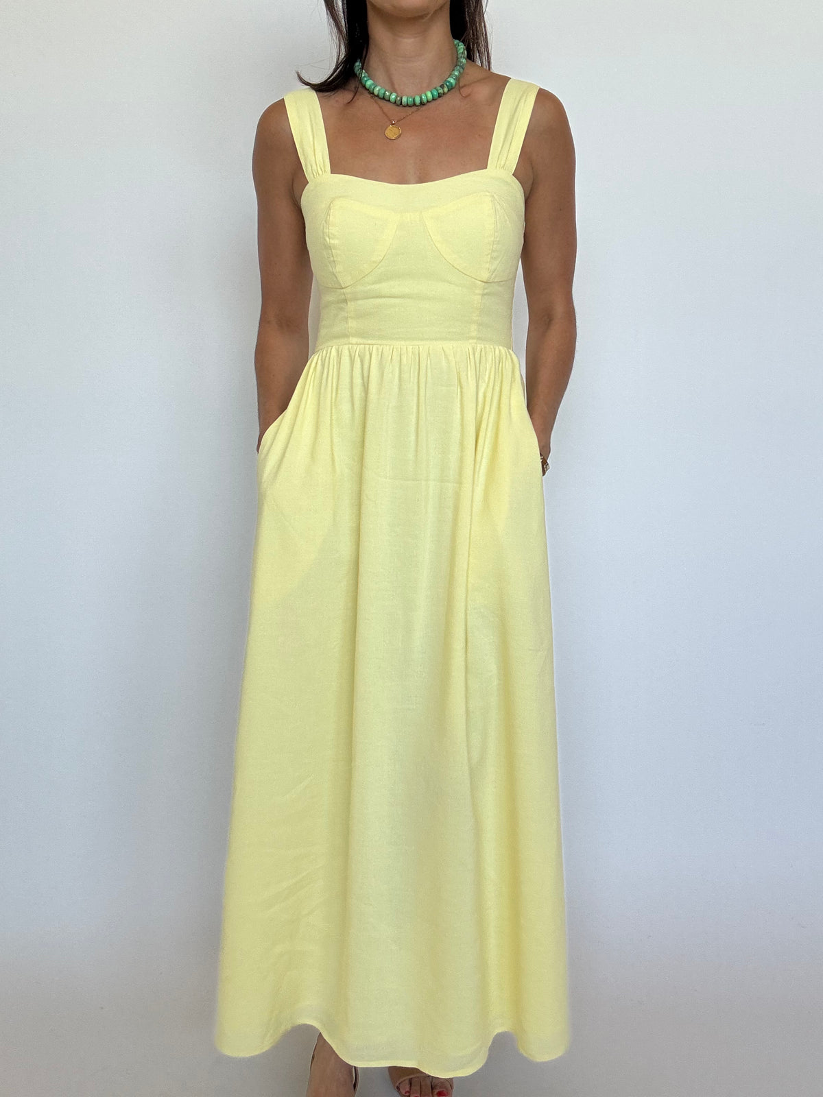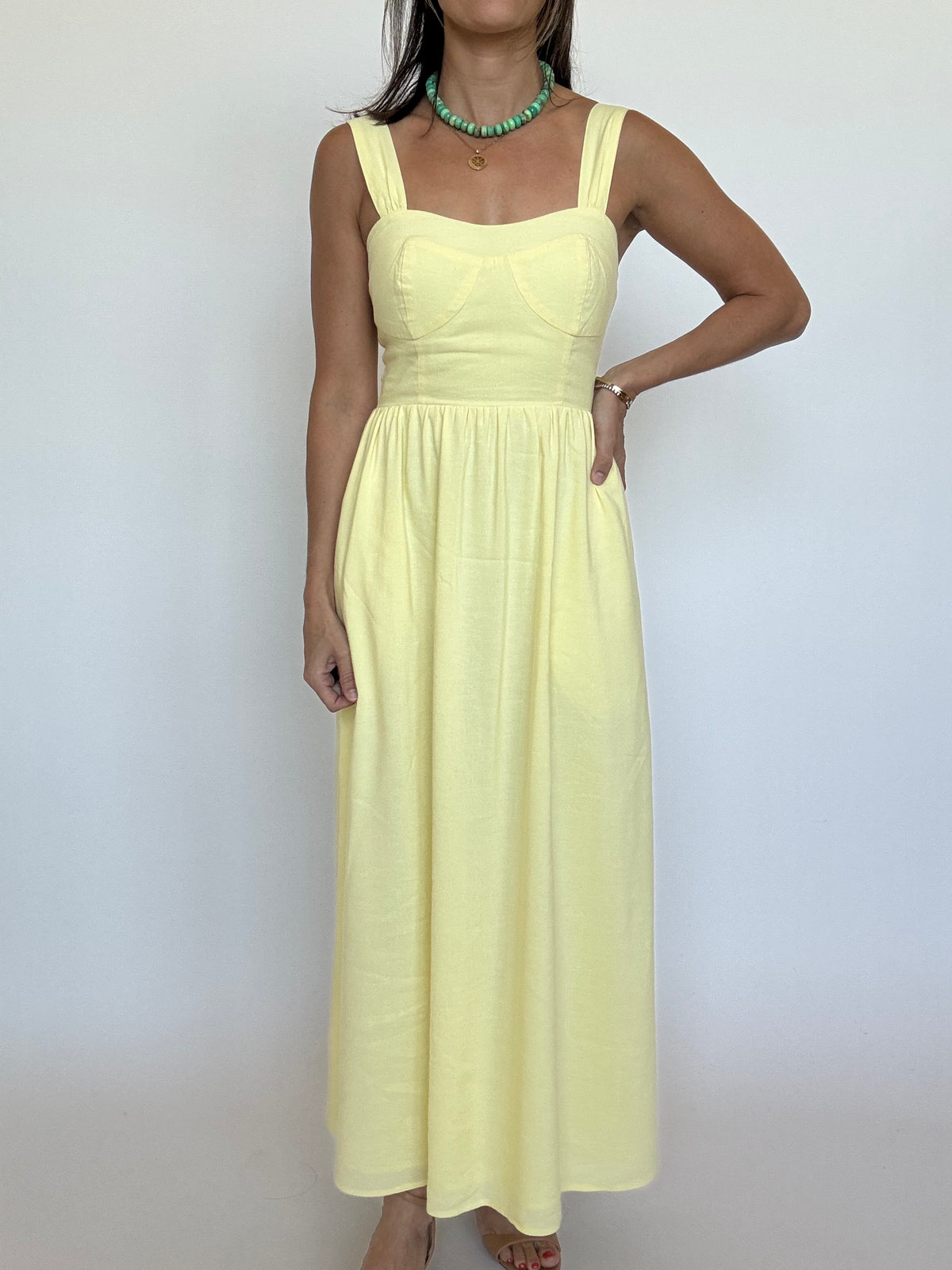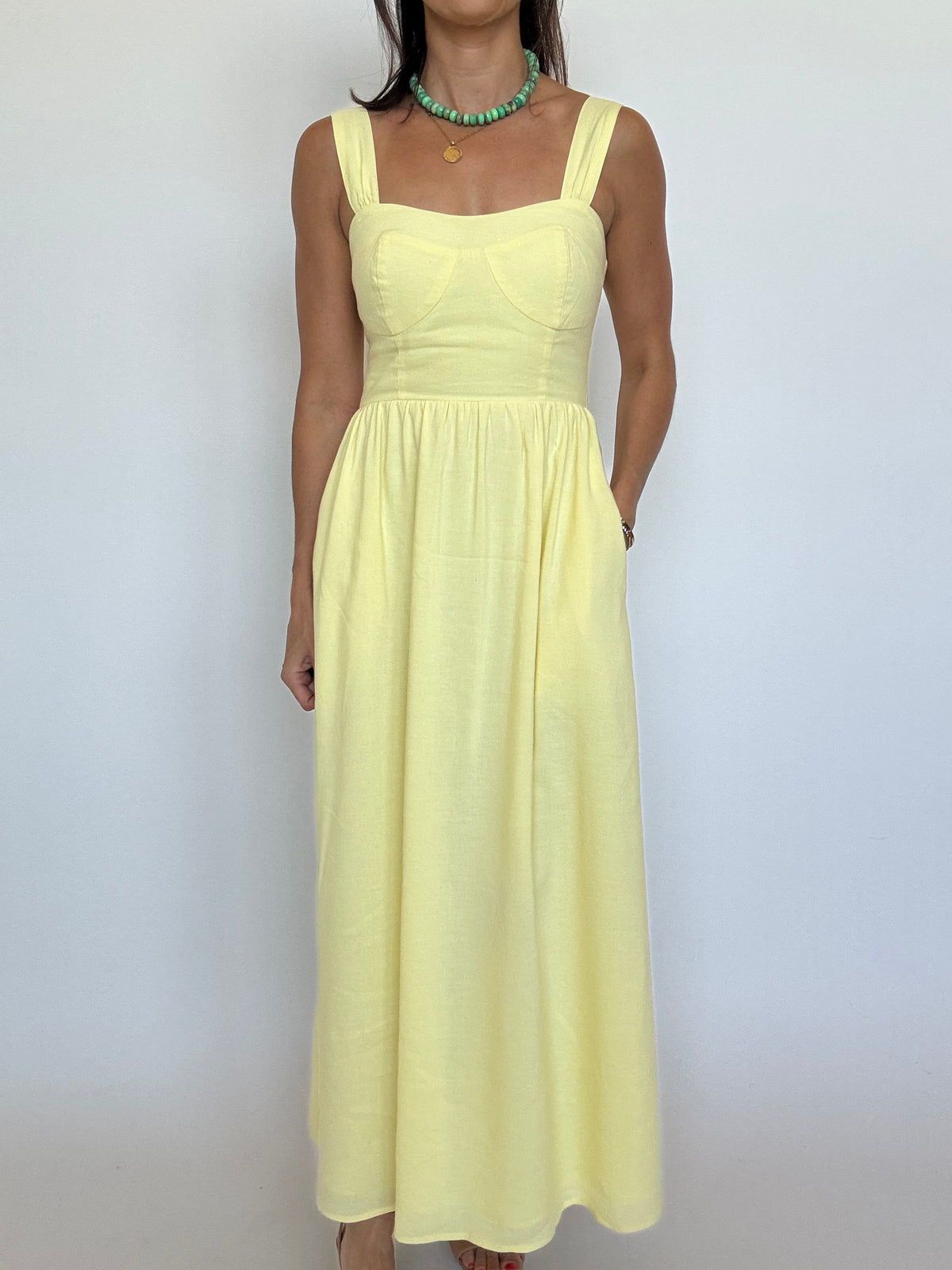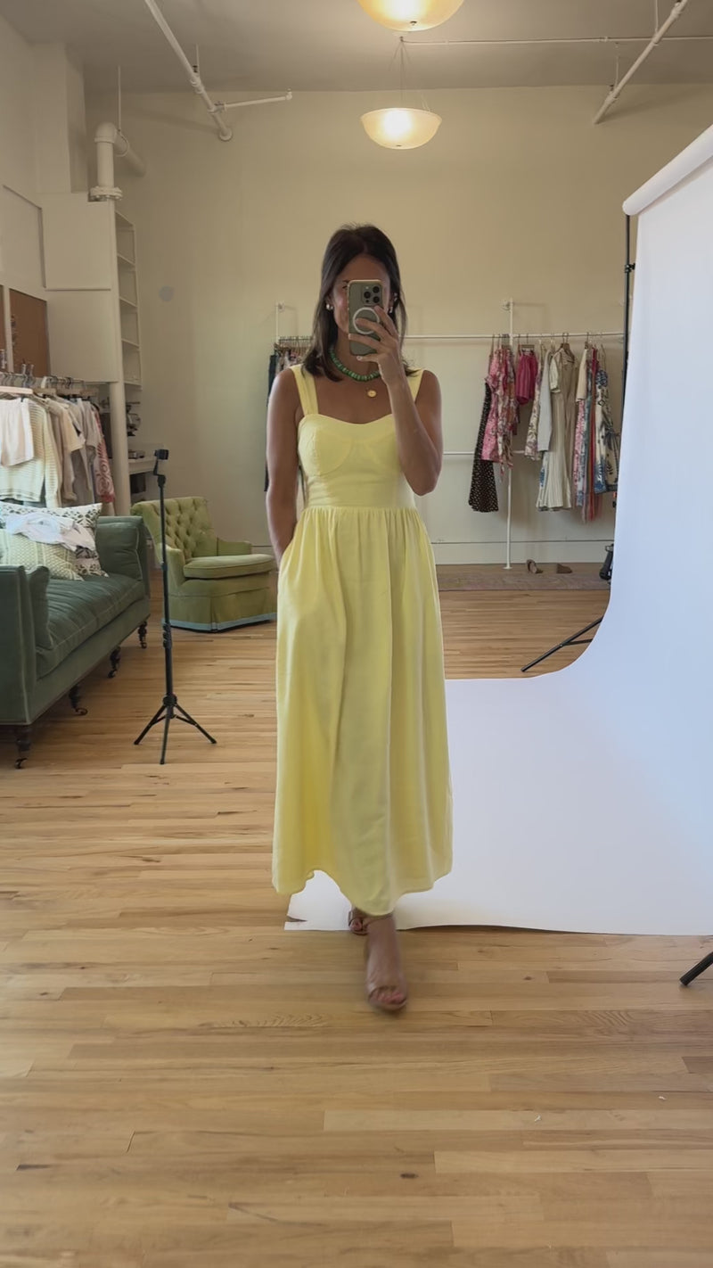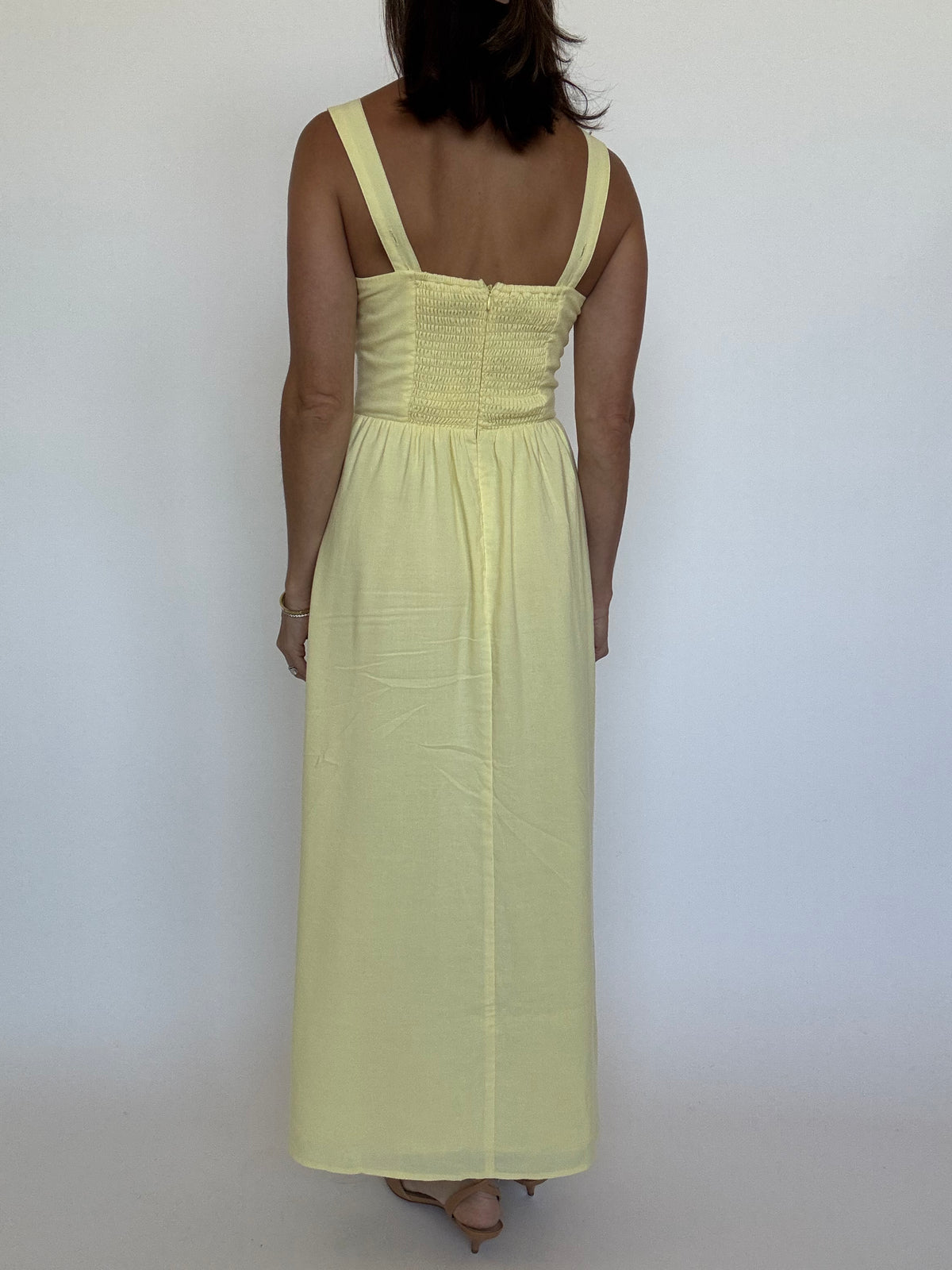 Designed with every detail in mind, this dream-worthy maxi features custom bust padding, adjustable button straps, a built-in zipper, and a beautifully smocked back. Fully lined and finished in the most gorgeous shade of yellow, it's the kind of dress that turns you into the girl someone spots across a cobblestone street.