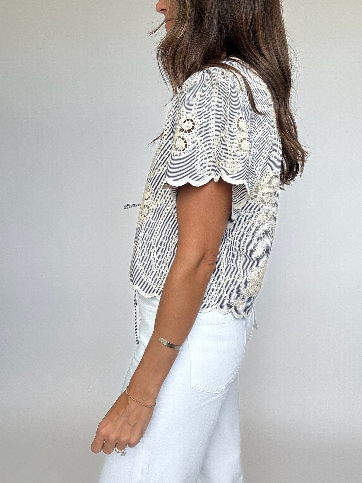 Black and cream pinstripe with floral embroidered detail, front tie closure