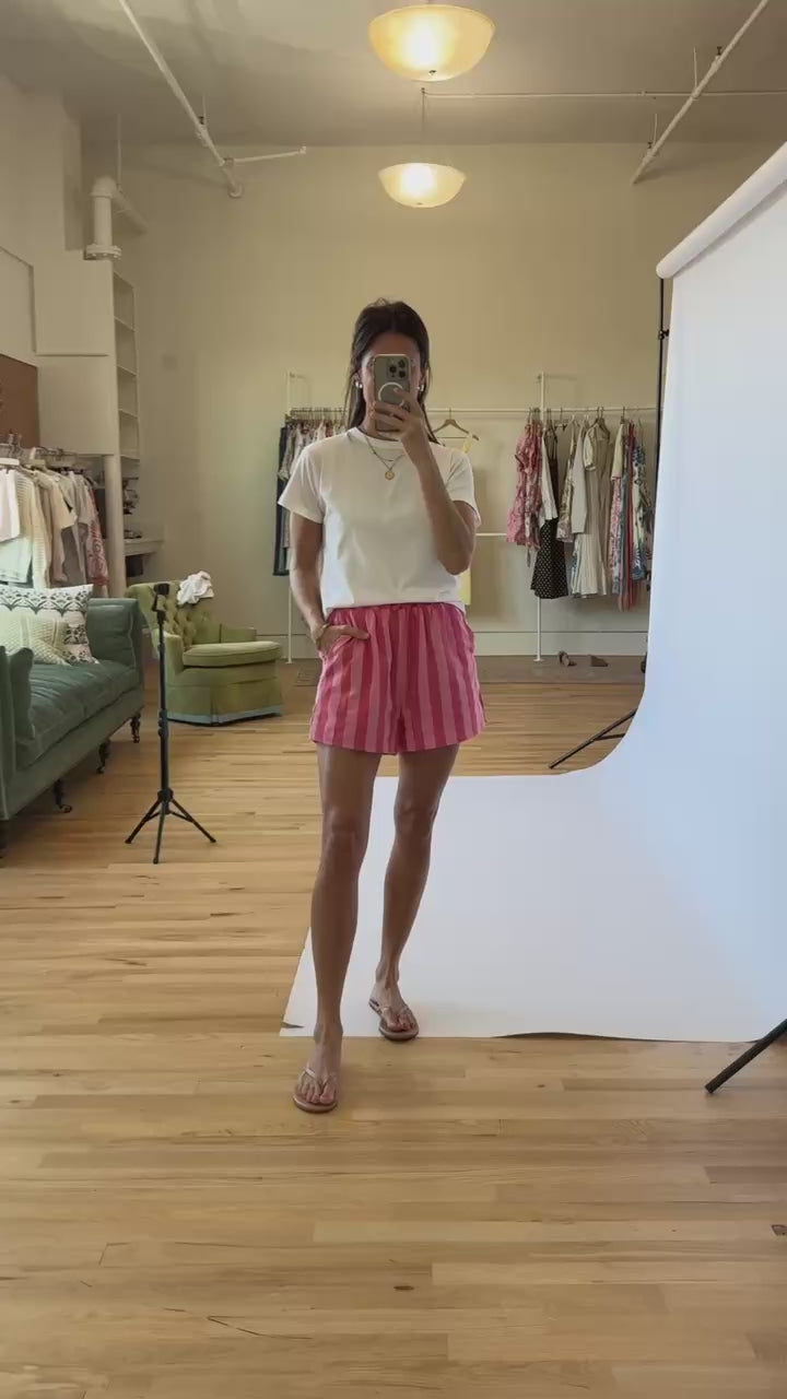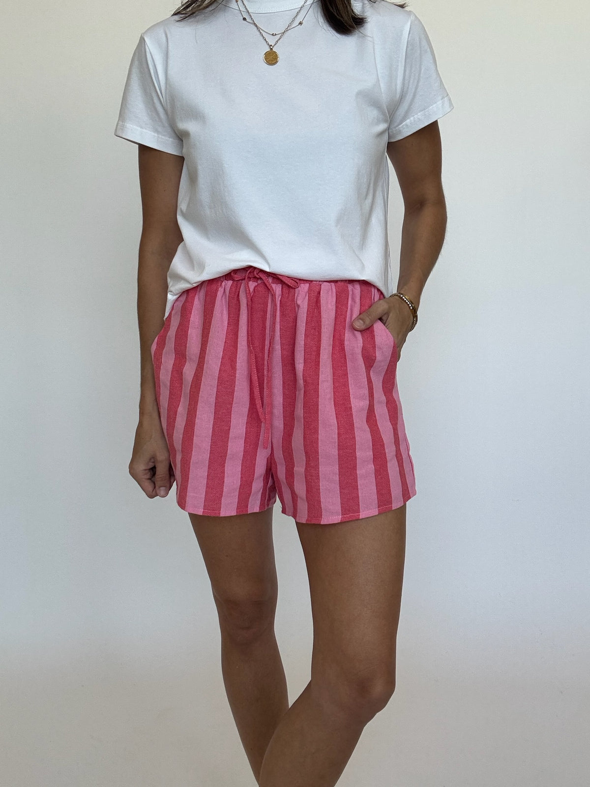 Effortless striped shorts in red and pink tones, designed for relaxed sophistication and a fun pop of color.