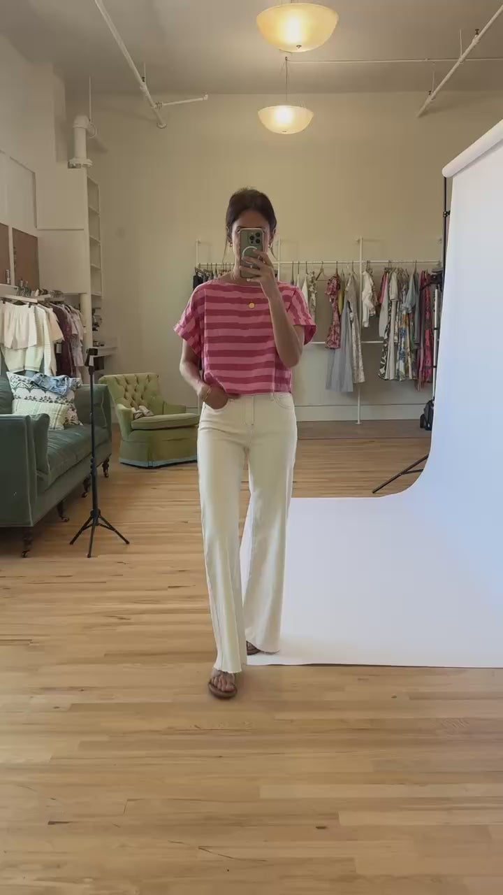 A timeless striped top in red and pink tones, designed for effortless layering and versatile everyday wear.